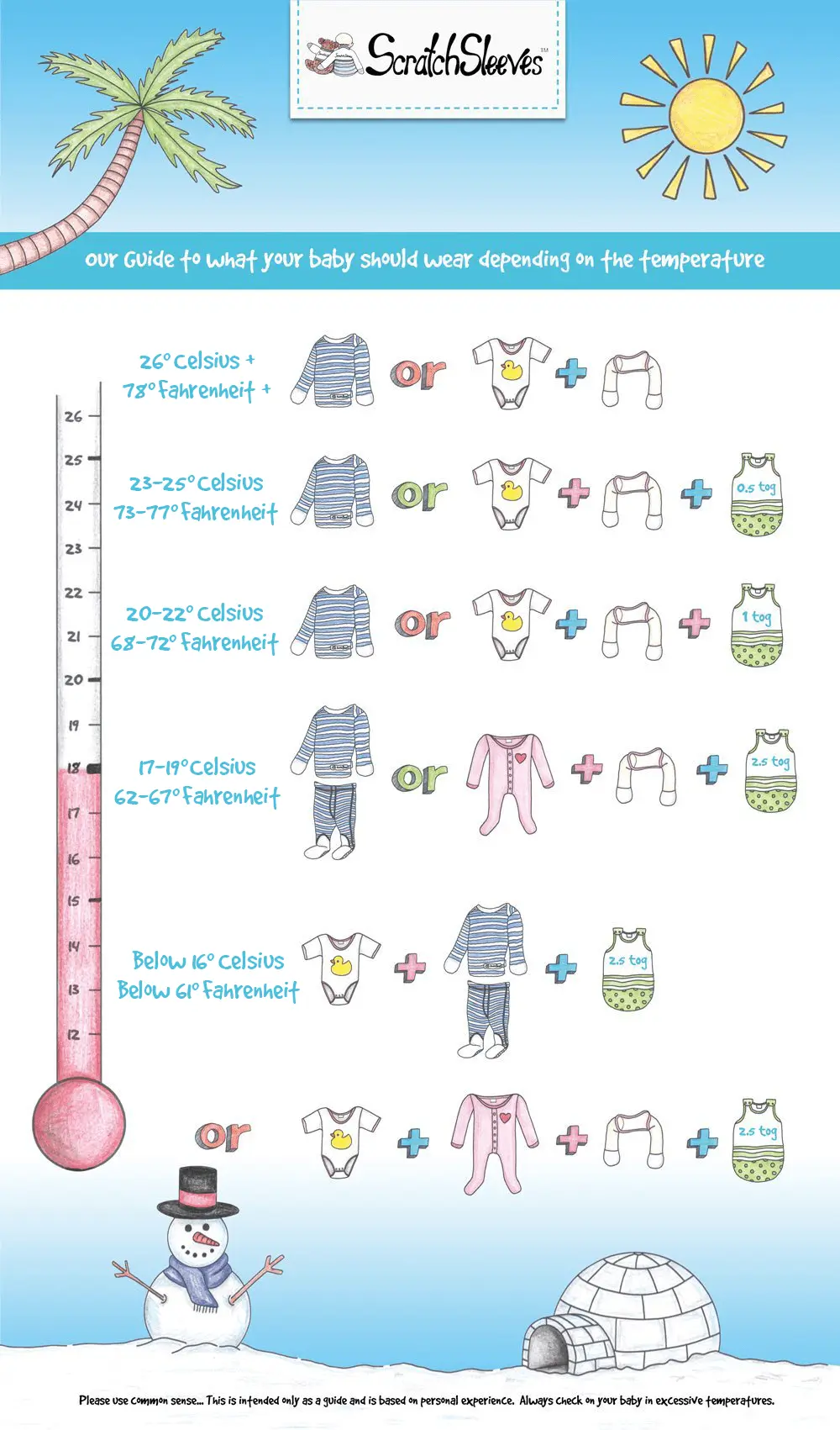 ScratchSleeves add an extra layer of clothing and overheating is a risk factor for cot death, so it’s important to adjust your baby’s bedclothes so that they don’t get too hot while they sleep. Also, getting too warm or cold will often make a baby wakeful – not ideal for an itchy little one who is already struggling to sleep. The ideal room temperature for a nursery is 16-20°C, but this can be tricky to maintain, especially in extremes of summer and winter. Our guide shows how to adjust your baby’s clothing (while still keeping their hands covered) to keep them safe and comfortable over a range of temperatures.