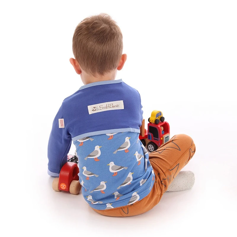 Smaller sizes (up to 9 months) have no shoulders and a cut-away neck line to keep little ones as cool as possible and so ScratchSleeves are easy for parents to use. We have added shoulders to the larger sizes to ensure they fit more comfortably and stay firmly in place on more active children.