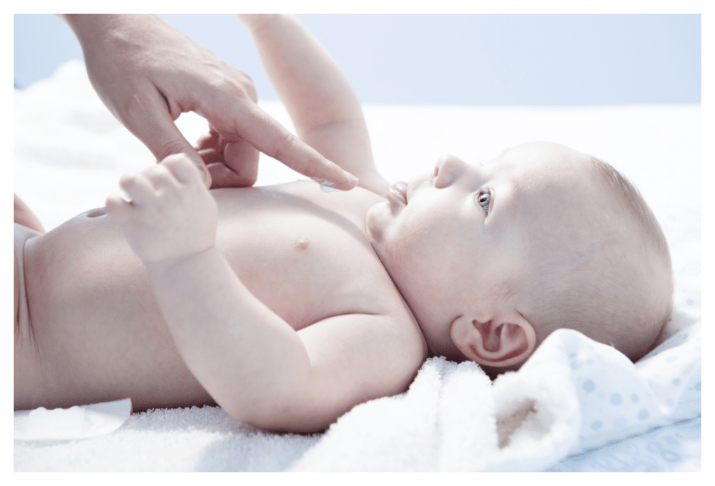Adult applying 1 finger tip unit of topical steroid cream to chest of baby lying on white blanket and looking at adult trustingly